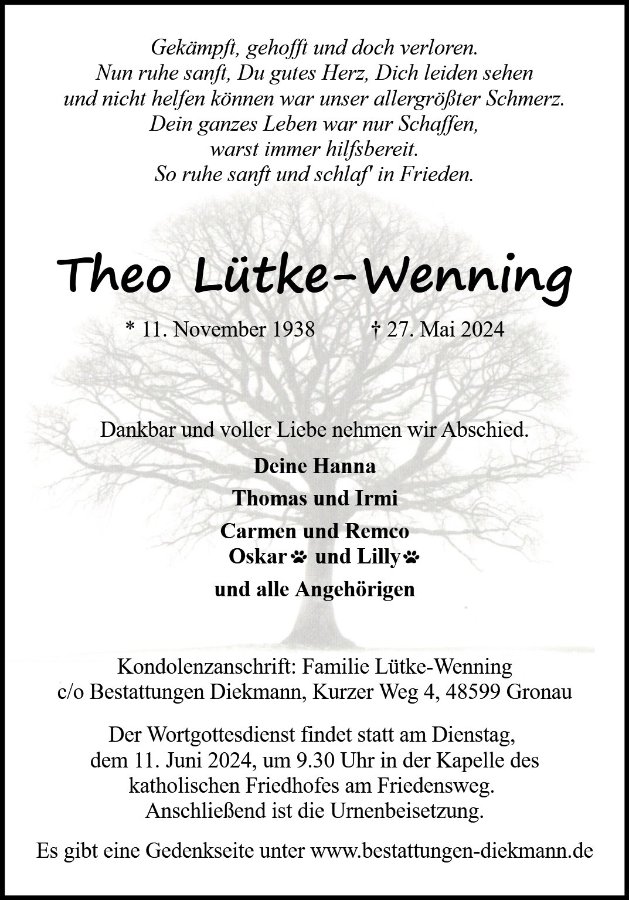 Mit Bedauern habe ich erst jetzt erfahren das Theo verstorben ist. Ich hab viele Jahre mit Theo in der Backstube Honerkamp in Ochtrup als Aushilfe verbracht. Ich denke oft daran zurück. Machst gut Theo.
